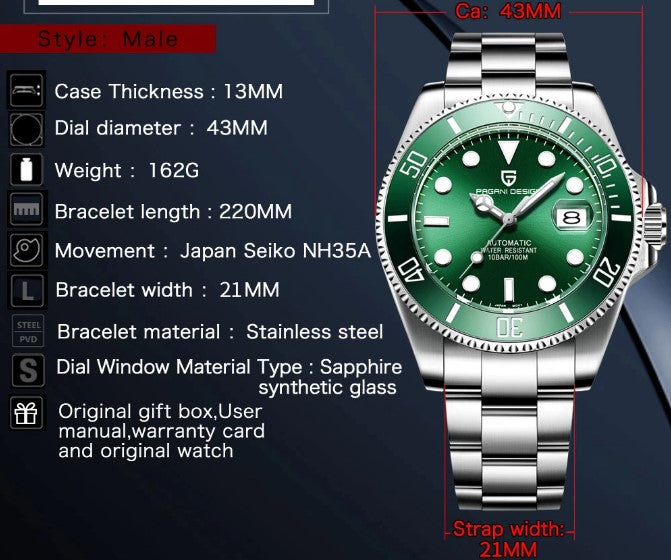 Reloj Hombre Pagani SUBMARINER GREEN Maquinaria Automatica Seiko, Acero Quirurgico, 100% Original
