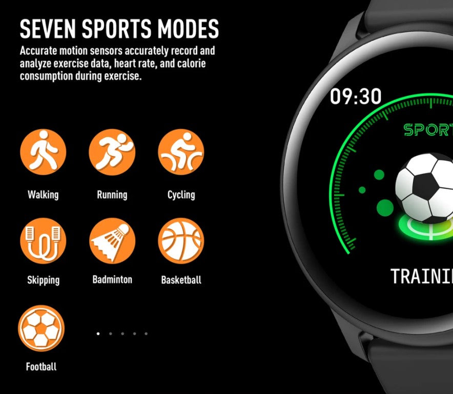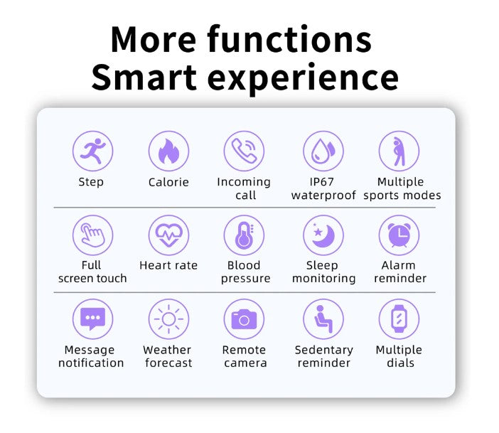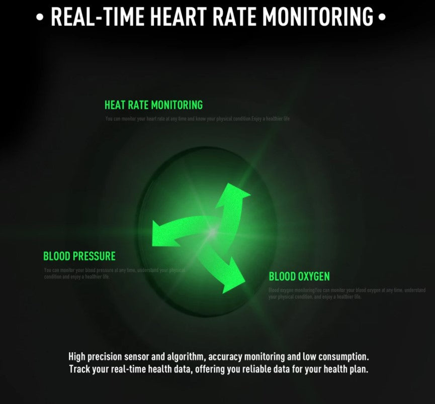 - -24 horas de detección continua de frecuencia cardíaca, monitoreo de presión arterial, Ciclos de sueño, visualización de tiempo/reloj, pasos, calorías, distancia, sueño, cámara, control de música