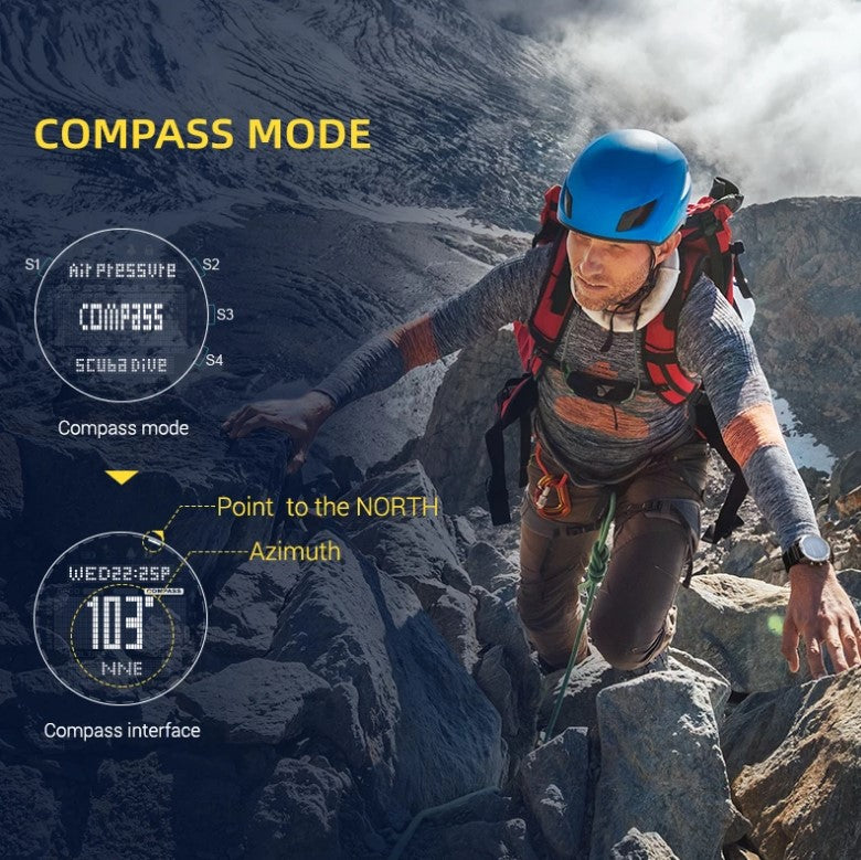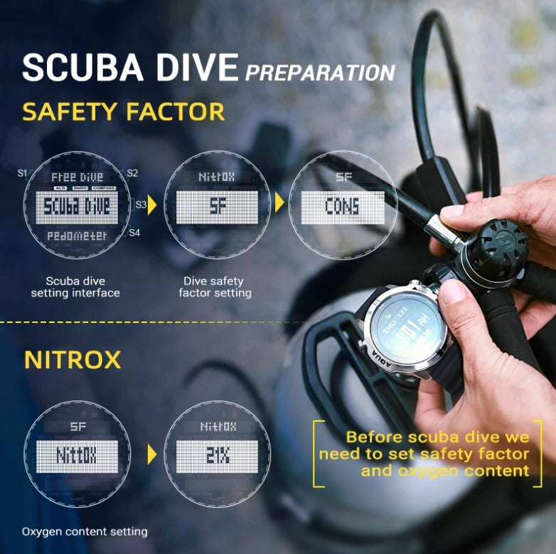 - Funciones de buceo: Incluye modos de buceo libre (freediving) y buceo con tanque (scuba diving) con alertas de profundidad, tiempo de descompresión y límites sin descompresión (NDL).