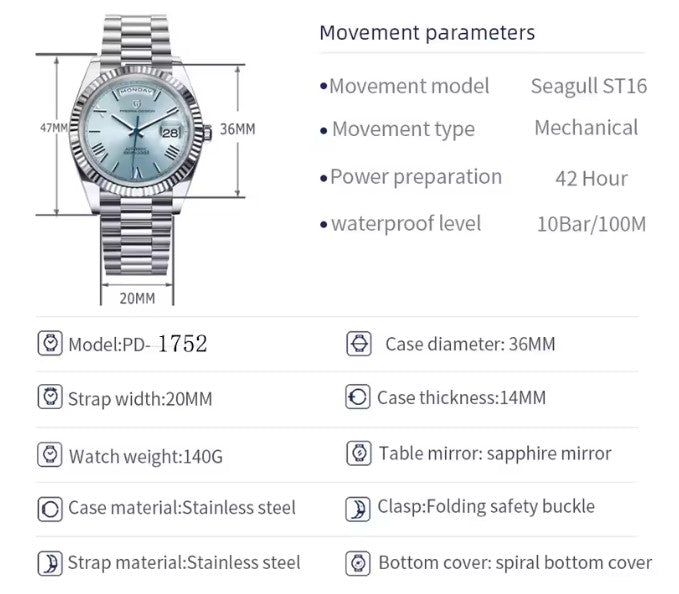 Reloj PAGANI "DAYDATE PRESIDENT" Clásico Automático Cristal de Zafiro